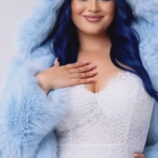 Este abrigo es puro glam de invierno. Pelo suavecito tipo nube, color azul polvo súper elegante y una capucha que te deja con cara de “yo no paso frío, yo paso lista”.