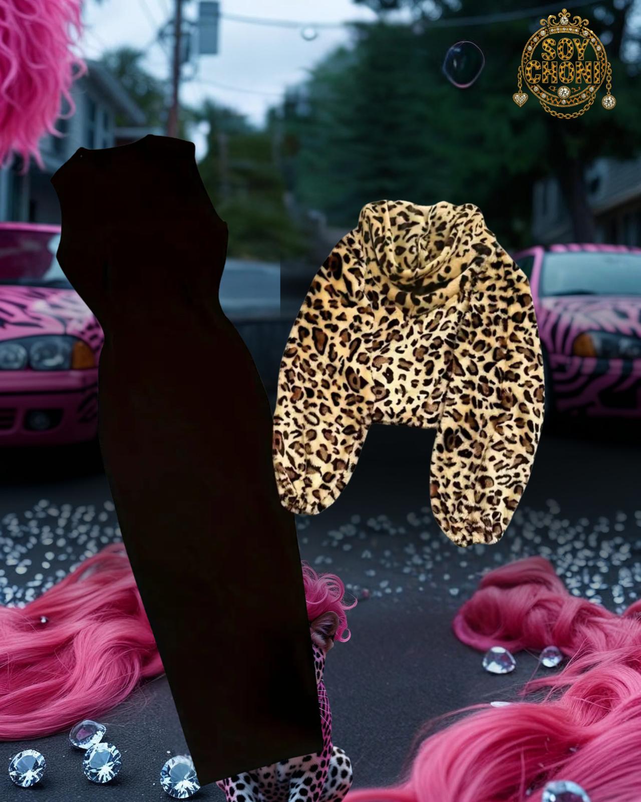 El vestido negro ceñido lleva franjas verticales de leopardo que estilizan y hacen que se te vea todavía más diosa. Y como lo bueno nunca viene solo, le sumamos una chaqueta de manga larga en full leopardo para que entres en cualquier sitio con actitud de alfombra roja (aunque sea el Mercadona).