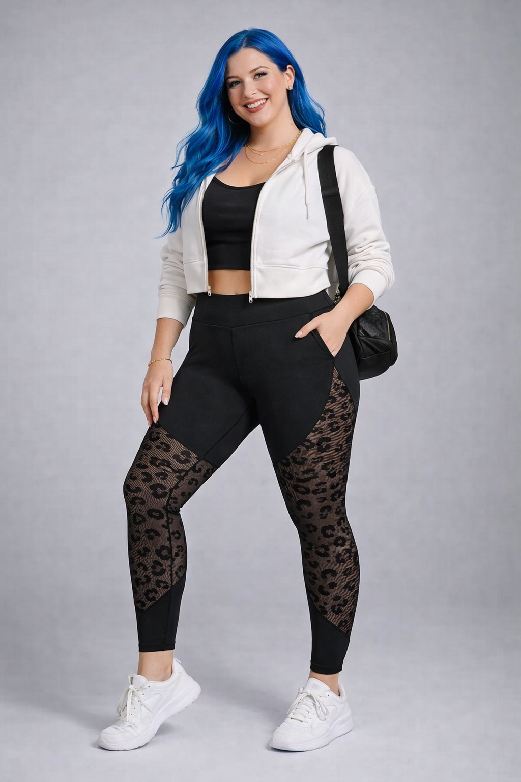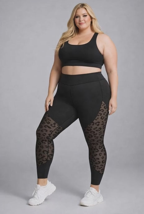 Cintura alta que sujeta sin asfixiar, tejido elástico que acompaña tus curvas y paneles de red con leopardo para que se note el flow sin enseñar lo que no toca.