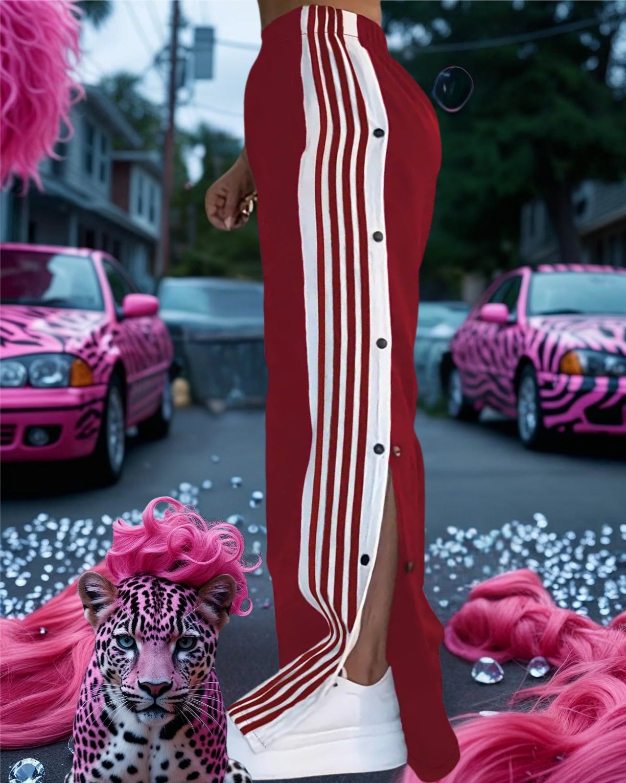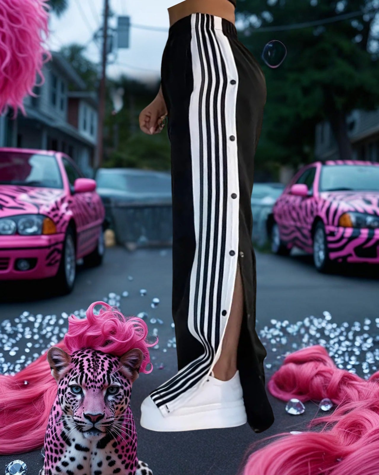 El corte ancho te da movimiento y actitud, mientras las rayas blancas alargan tu figura como si tuvieras un filtro de Instagram en la vida real.