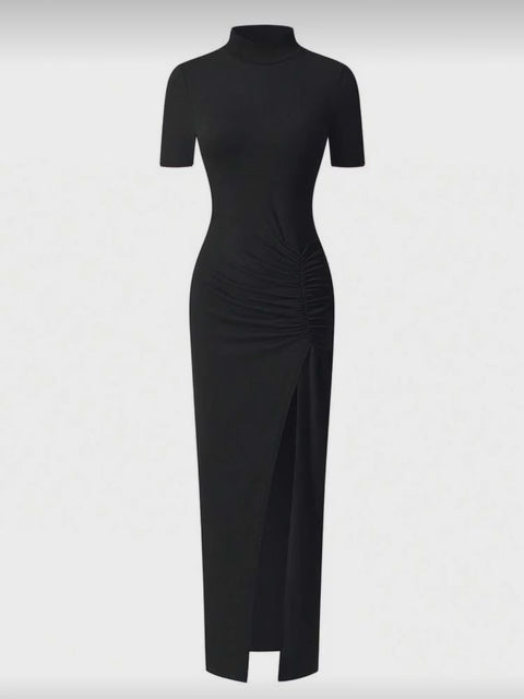 Vestido largo de mujer con cuello alto y ajuste ceñido que marca curvas sin pedir permiso. El fruncido lateral estiliza, la abertura sube la temperatura y el negro lo convierte en un clásico peligroso: elegante, grácil y absolutamente irresistible. Perfecto para noches donde quieres que miren… pero no toquen.
